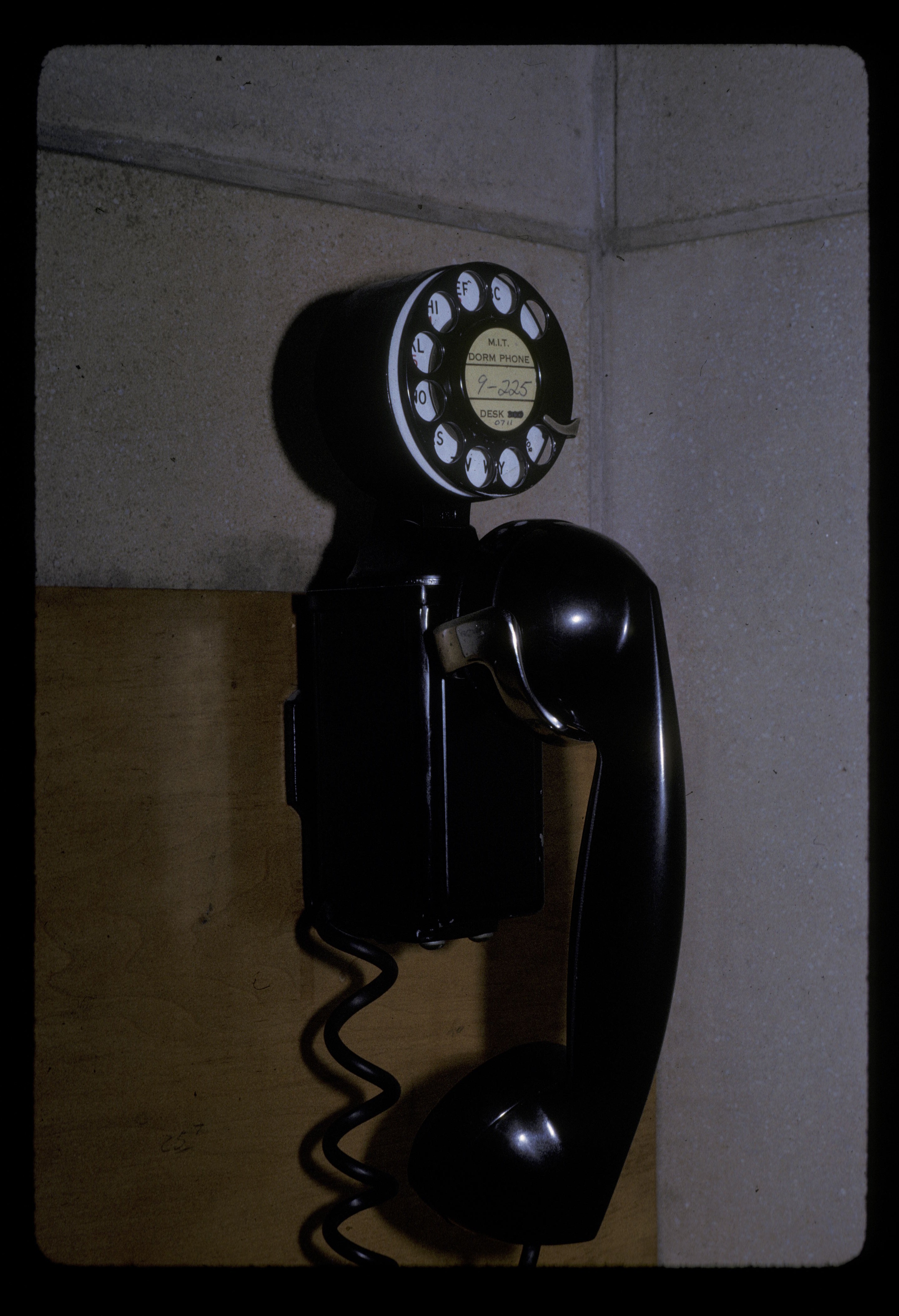 | The Early Years In many ways, the M.I.T. Dormitory Telephone System (“Dormphone”) originated in the Electrical Engineering Department, as that department employed two of the key figures in Dormphone history, Professor Carlton E. Tucker and Frederick E. Broderick. It is highly probable that a 50-100 line automatic telephone system was installed in the EE Department in the 1920’s. This was followed in 1930 by the installation of a manual switchboard in the East Campus dormitories, and later in the 1930’s by a similar installation at the Graduate House. The Graduate House was later named “Ashdown” in honor of Avery Ashdown, its longtime House Master, and will be referred to henceforth by that name. Automatic switching of dormitory calls began in 1949 with the installation of an Automatic Electric Company 300-line dial system in the new Baker House Dormitory. A telephone of the style used in Baker is shown in the photo, although the photo was taken in the Building 7 lobby.