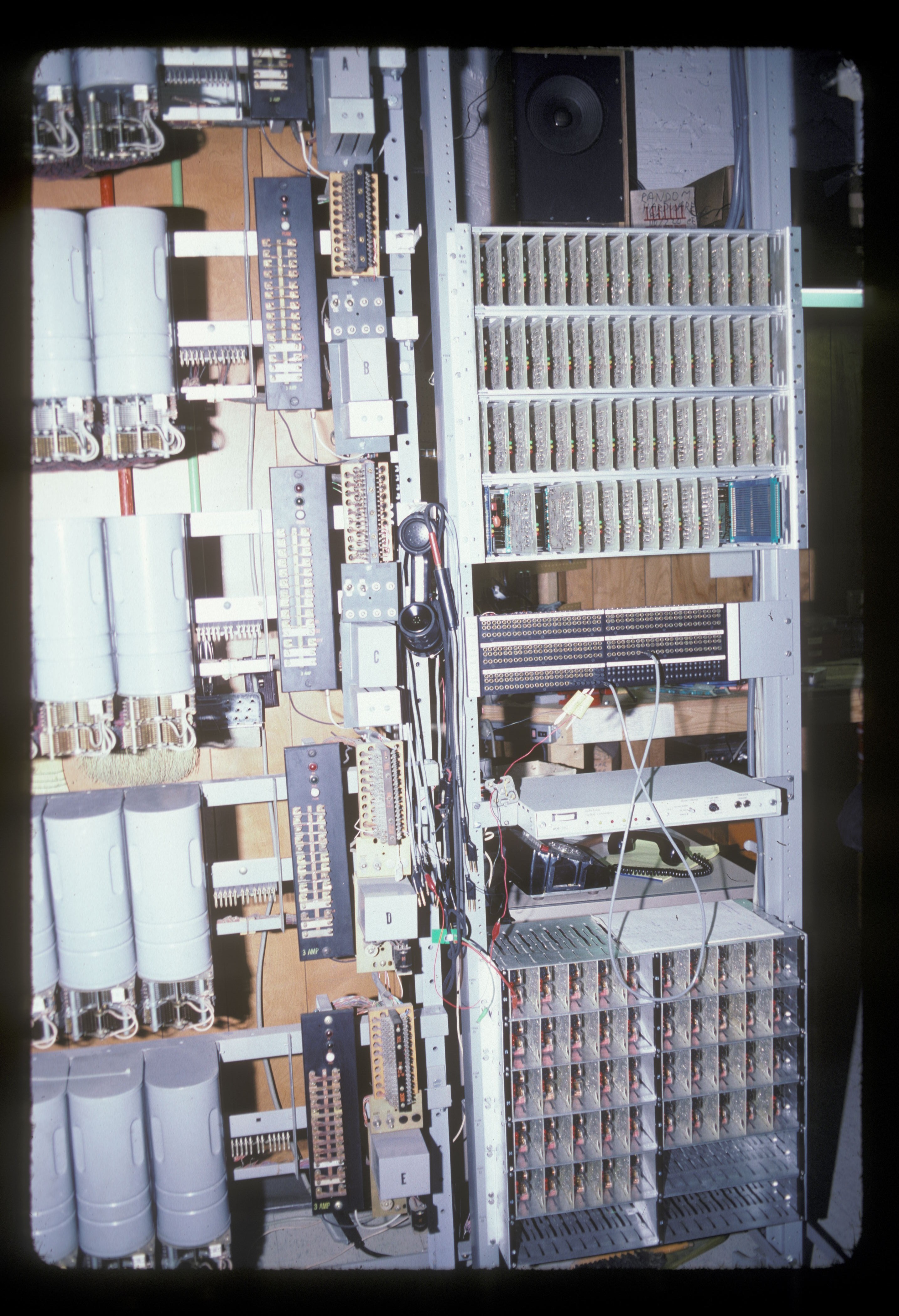 | The 1970's and 1980's In many ways, these years were the "Golden Age" of Dormphone. The small switching system located in Baker was consolidated into the Ashdown system. New dorms were built in the West Campus, with corresponding additions to the switching equipment in Ashdown. Most important, however, was the advent of direct interconnection between the Dormphone system and the Institute telephone system provided by New England Telephone. Since MIT did not want the time and expense of sending phone bills to students, only credit card and collect calls could be originated, and only paid calls could be received. To ensure that no collect calls were accepted, a recording was inserted on all incoming calls that said, "This is MIT. Collect and third party calls are not accepted at this number." The apparatus to perform this task was designed by Dormphone personnel. The announcement machine, commercially made, was the most modern device to ever grace Dormphone; it used digitized speech stored in 64K RAM chips. The interface cards and announcement device are shown in the photo at left. Two other thoughts come to mind: 1) The sound of New England Telephone system (1A ESS) calls coming into our switching equipment was very impressive - maximum speed, perfect dial pulse strings, with only 600 ms interdigital delay. 2) In its early life, the ESS crashed several times, sometimes for over an hour. Various MIT administration people demanded that "reliable telephones" be installed in three or four critical offices on campus. Dormphones, served by our ancient equipment, were installed!