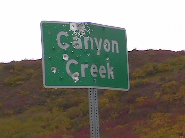 | We drove across the state on the Denali Highway, which includes 115 miles of dirt road (don't tell Avis!). We happened to be in Alaska during the roadsign hunting season. |